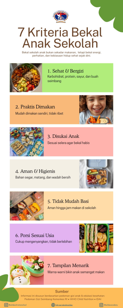 Bekal sekolah yang baik bukan harus mewah, tetapi cukup gizi, aman, dan disiapkan dengan penuh perhatian. Berikut adalah 7 Kriteria Bekal Sekolah Anak yang diringkas dari beberapa sumber terpecaya seperti Pedoman Gizi Seimbang Kemenkes RI, WHO Child Nutrition & IDAI.
